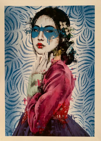 Much like Beardsley, Fin DAC found inspiration in traditional Japanese woodblock prints, as well as being drawn to more contemporary and accessible art forms such as manga, graphic novels and science fiction. His female portraiture incorporates a variety of seemingly opposing elements, centring around women who stand between worlds, mixing traditional dress and iconography with modern attitudes. A thread can be seen running through his portraiture conveying a sense of pride and dignity that feels almost conservative, though simultaneously suggesting a less serious, more playful side.