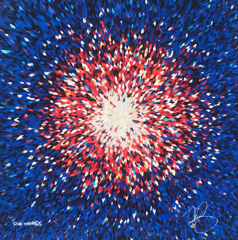 Mixed media and self-taught artist, Robi Walters is currently Aston Martin’s Artist-in-Residence. He is widely known in the contemporary art scene for his mesmerizing abstract mixed media collage works made up of thousands of upcycled paper and card petals, and sometimes the odd broken LP record. The structure of Robi’s work is based on sacred geometry. The origin of the petal shape is one of the most basic shapes in sacred geometry and is repeated in his work to create a thousand petalled lotus to represent the infinite whole, symbolising both microcosm and macrocosm. The petals are all arranged in a lotus flower-like form that echo his avid and daily practice of meditation. The organic and fluid nature of the works offer a sense of infinity and calm.